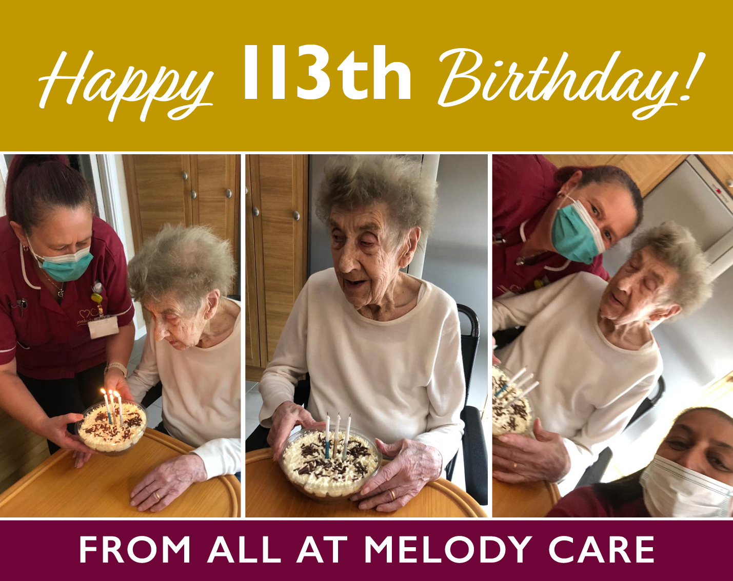 Many congratulations to our Melody Care Aldershot client who is celebrating her 113th birthday! Her wonderful Professional Carers surprised her with a cake before she was joined by her family to celebrate the joyous occasion.